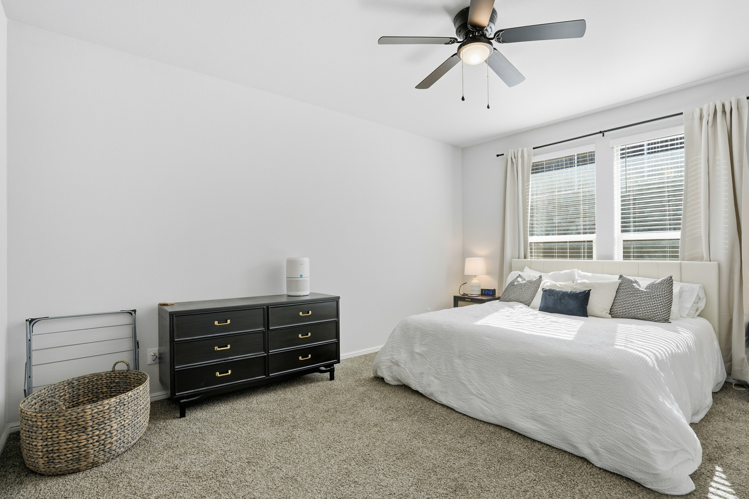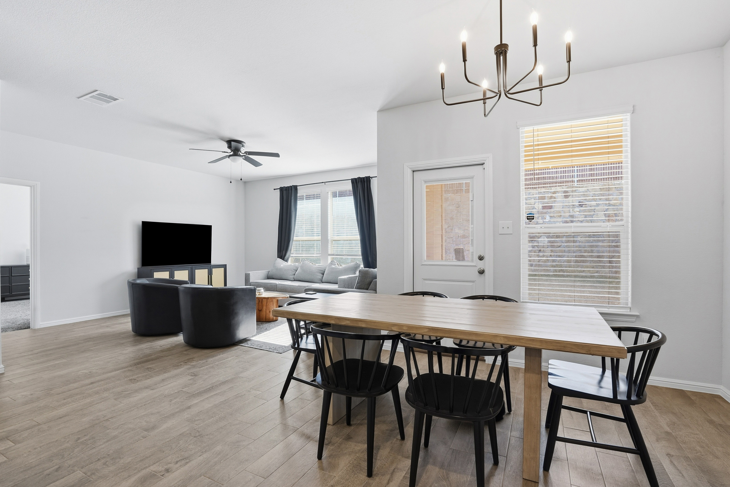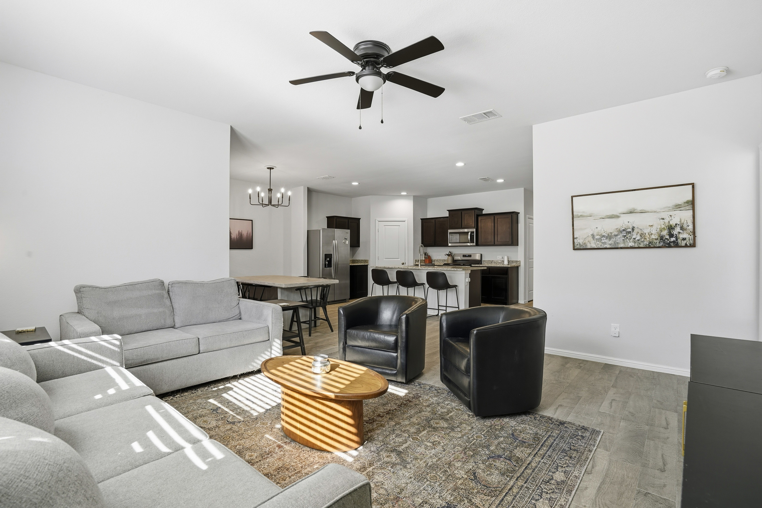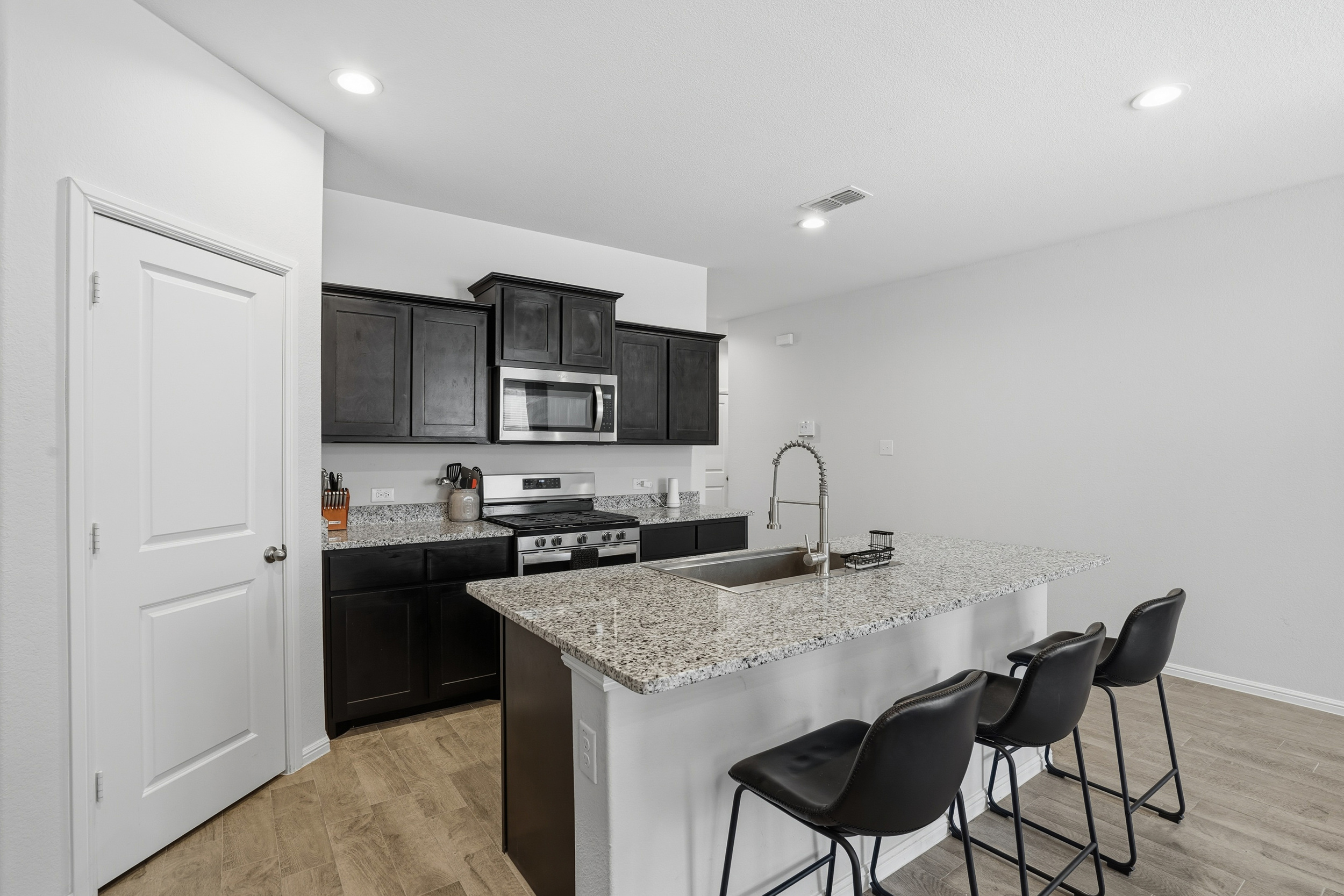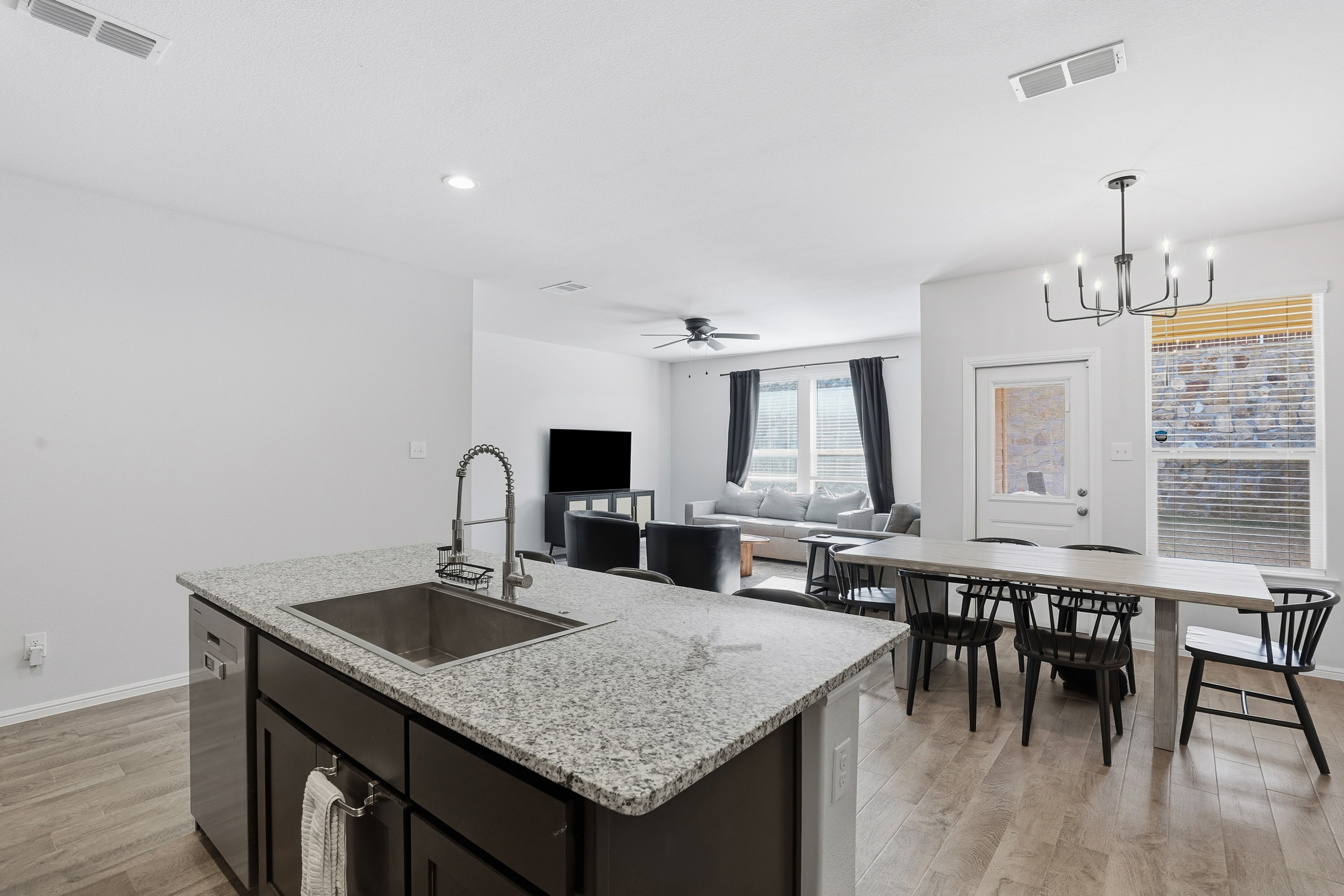 Spacious, beautiful 2023 D.R. Horton home featuring a large chef’s kitchen with granite countertops, stainless steel appliances, gas range, seating island, with updated farm sink and light fixtures plus a walk-in pantry. Split-bedroom layout with a private primary suite offering dual sinks, oversized shower, and walk-in closet. Tiled entry, hallways, and wet areas plus smart home technology throughout. Enjoy a covered front porch and back patio, fenced backyard, gas tankless water heater, gutters, and full sprinkler system. Community amenities include a large pool, cabana, and playground. Minutes from DFW Airport, downtown Fort Worth, shopping, dining, and more!